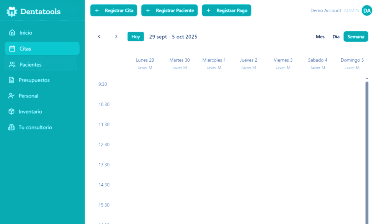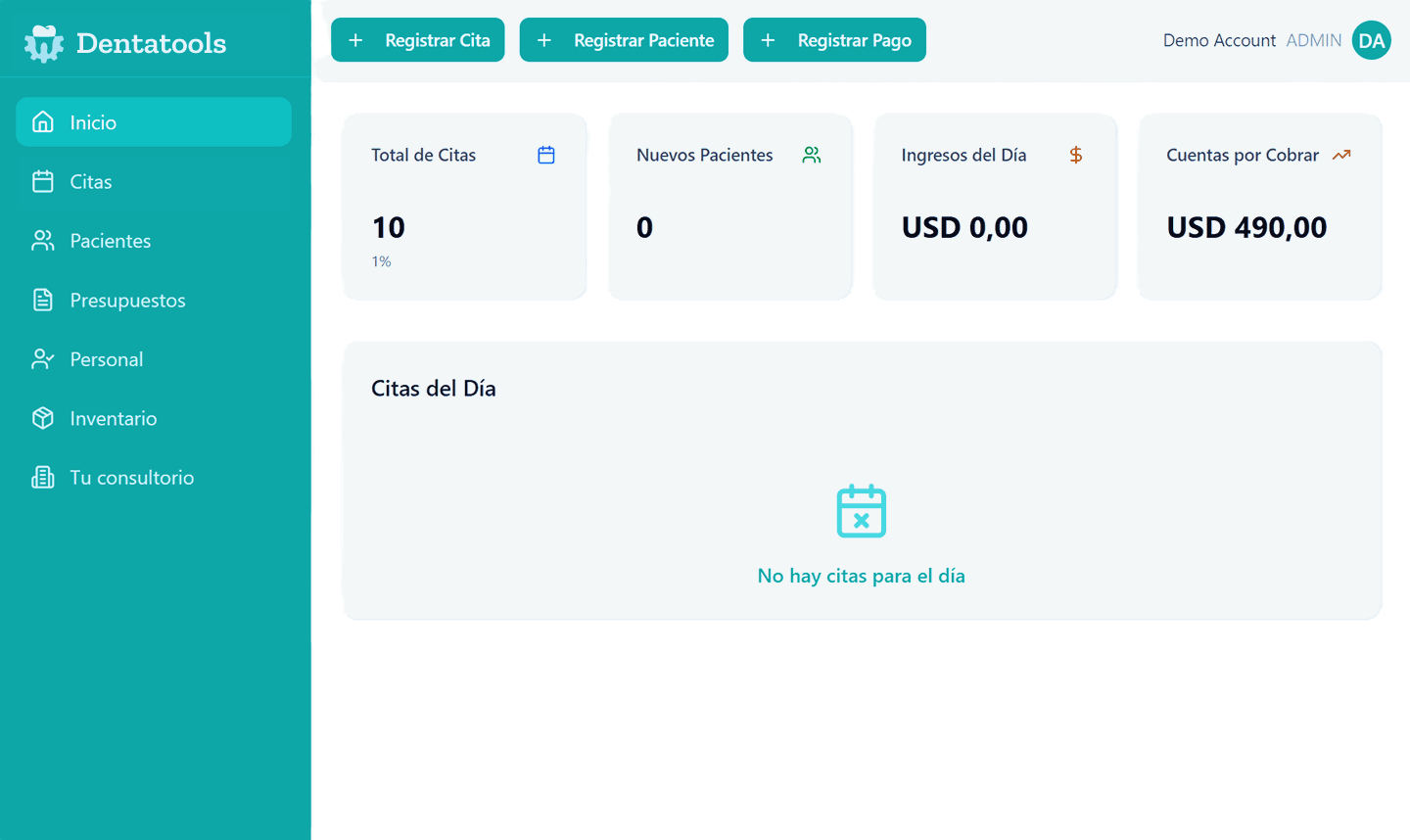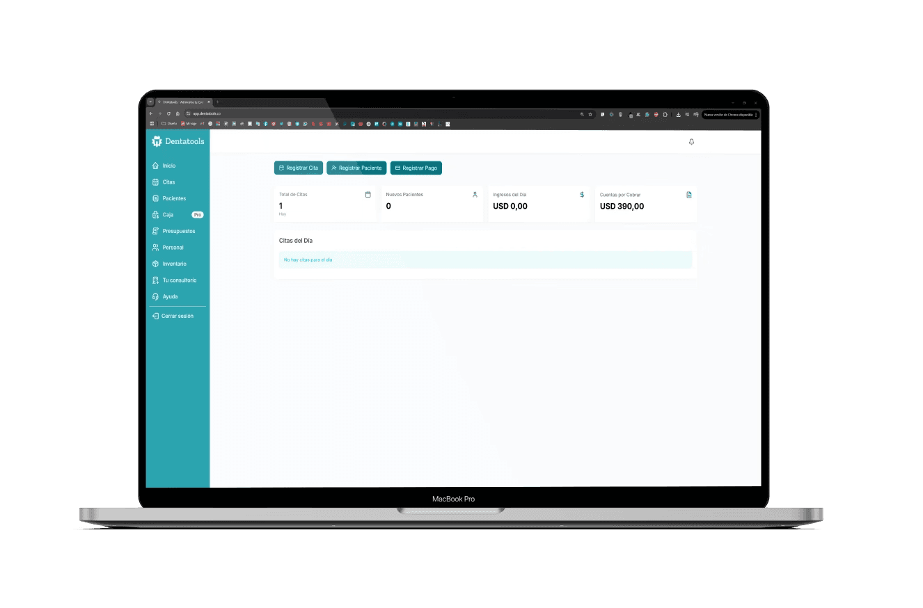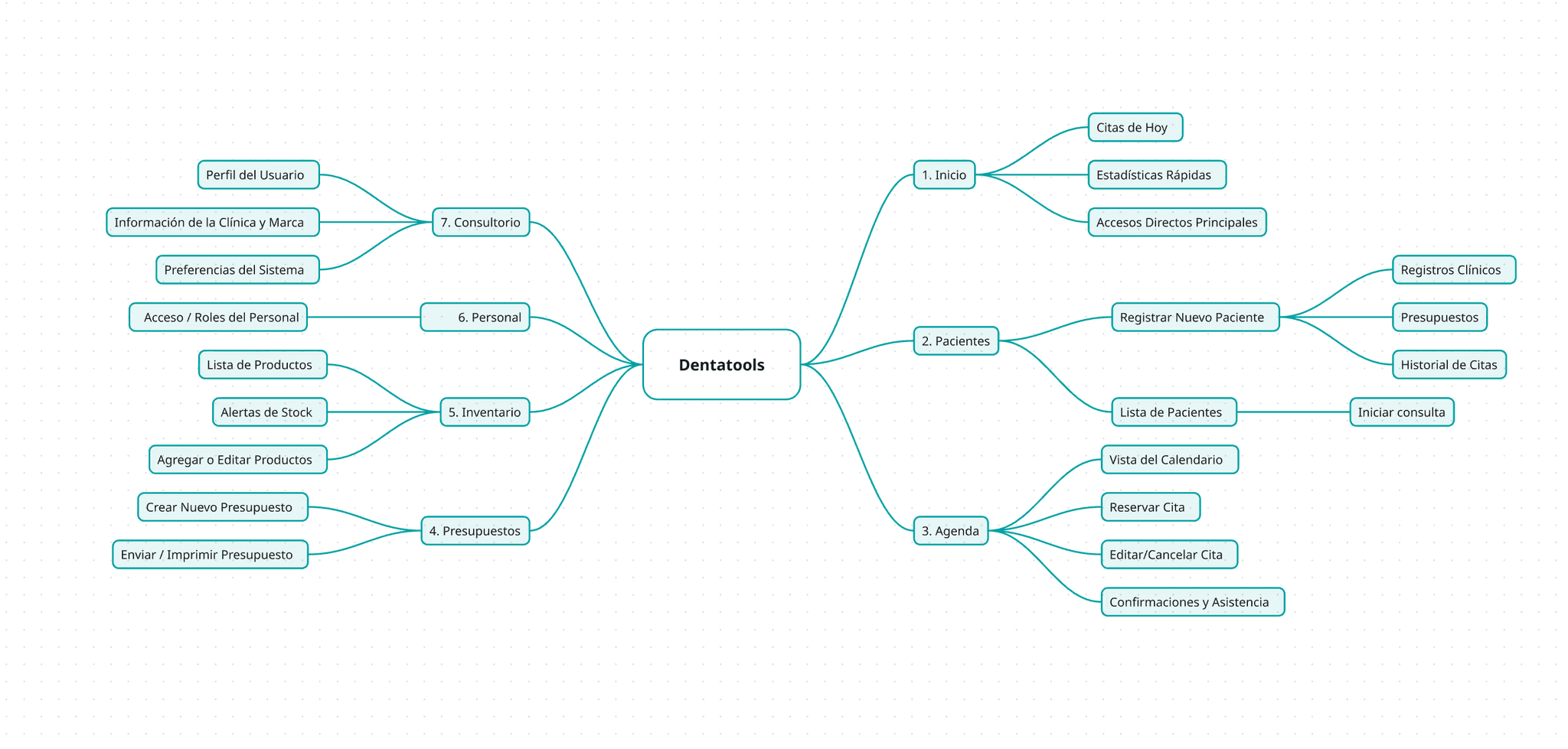 Dentatools es un software de gestión para odontólogos y clínicas dentales pequeñas y medianas. El objetivo era centralizar agenda, pacientes, presupuestos e inventario en una plataforma clara y fácil de usar para usuarios con baja experiencia digital.